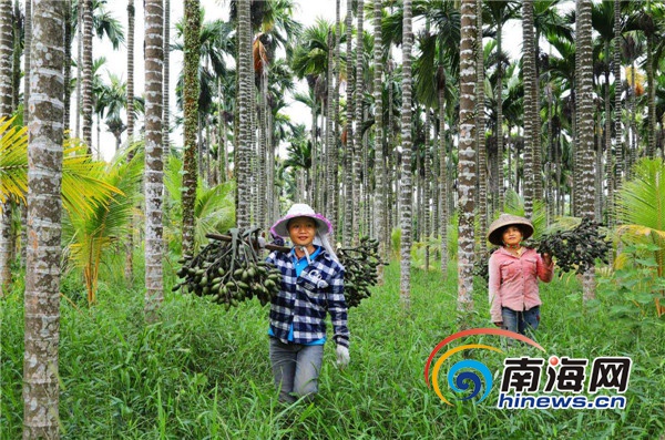 蔡先达精心管护,下的工多,舍得用肥,种植第八年,槟榔树进入稳产期,一亩地能结槟榔果800-1000斤。