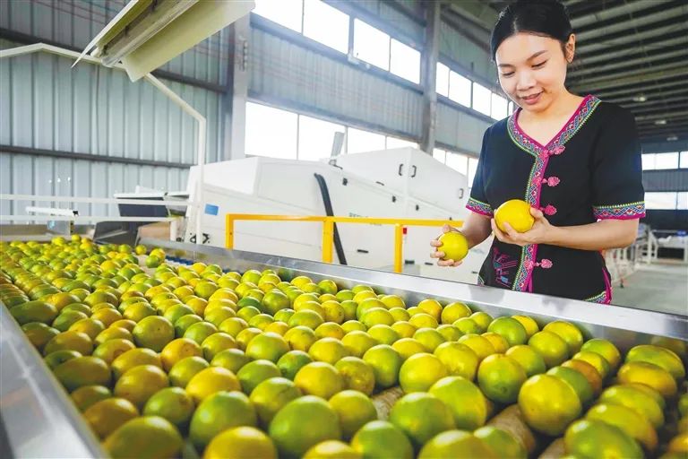 而在基地不远处,海垦龙江果品管控中心车间里,传送带转得飞快,智能分选机刷刷作响,对一个个饱满馥郁的红橙进行分级。